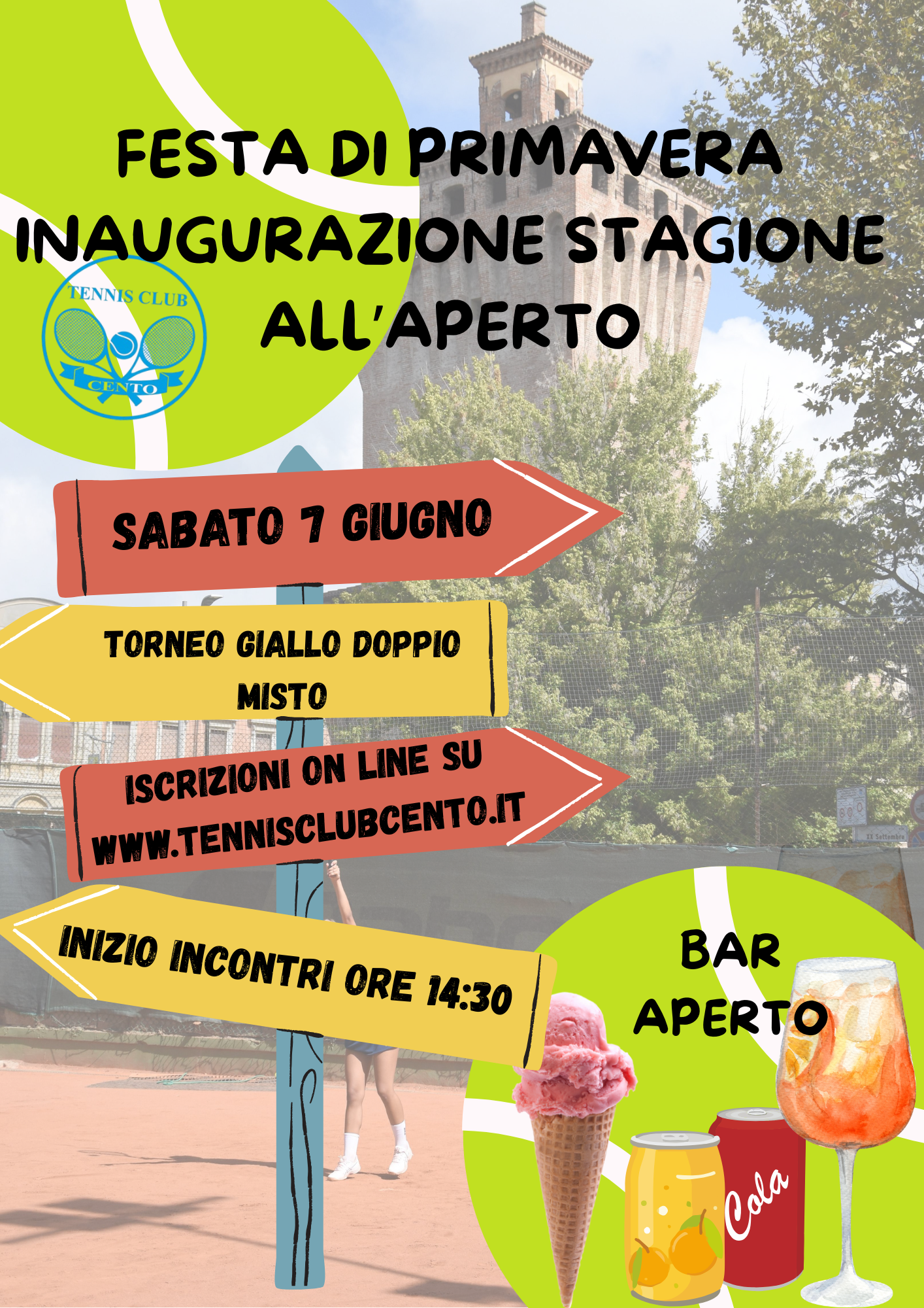 1) Il Tennis Club Cento organizza il torneo sociale di doppio misto giallo, edizione 2025, che si terrà in occasione dell'apertura della stagione estiva prevista per il 07/06/2025